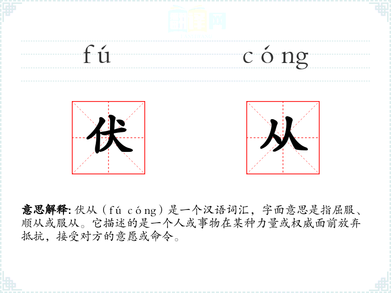 伏从(fú cóng)是一个汉语词汇,字面意思是指屈服、顺从或服从。它描述的是一个人或事物在某种力量或权威面前放弃抵抗,接受对方的意愿或命令。