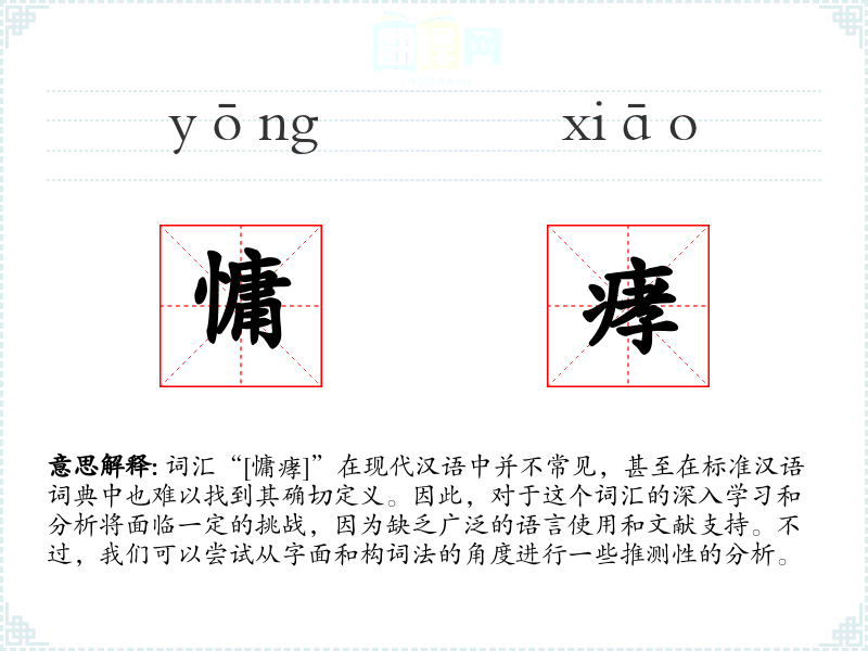 对于“慵痚”这个词汇的理解,我们主要依赖于对其构成汉字的分析和推测。在语言学习和表达中,这个词汇可能不具有实际的应用价值,但对于理解汉语的构词法和词汇演变有一定的学术意义。