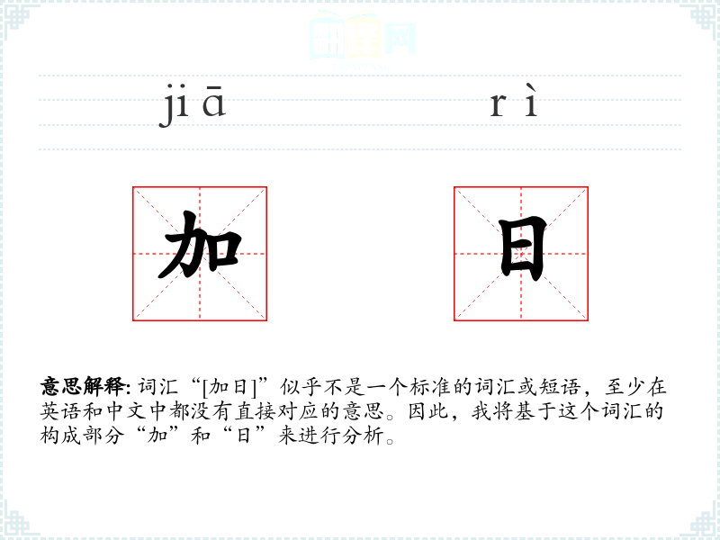 词汇“[加日]”似乎不是一个标准的词汇或短语,至少在英语和中文中都没有直接对应的意思。因此,我将基于这个词汇的构成部分“加”和“日”来进行分析。