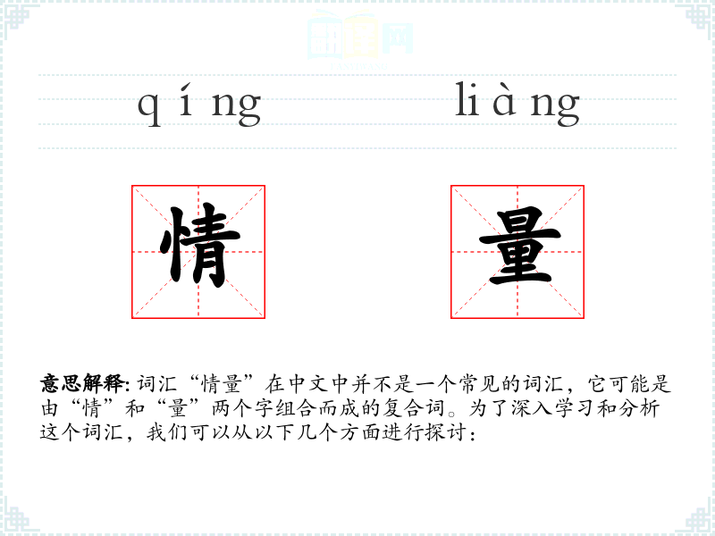 “情量”这个词的字面意思可能是指情感的强度或程度,或者是情感的衡量标准。然而,由于这个词汇并不常见,其确切含义可能需要根据具体语境来确定。