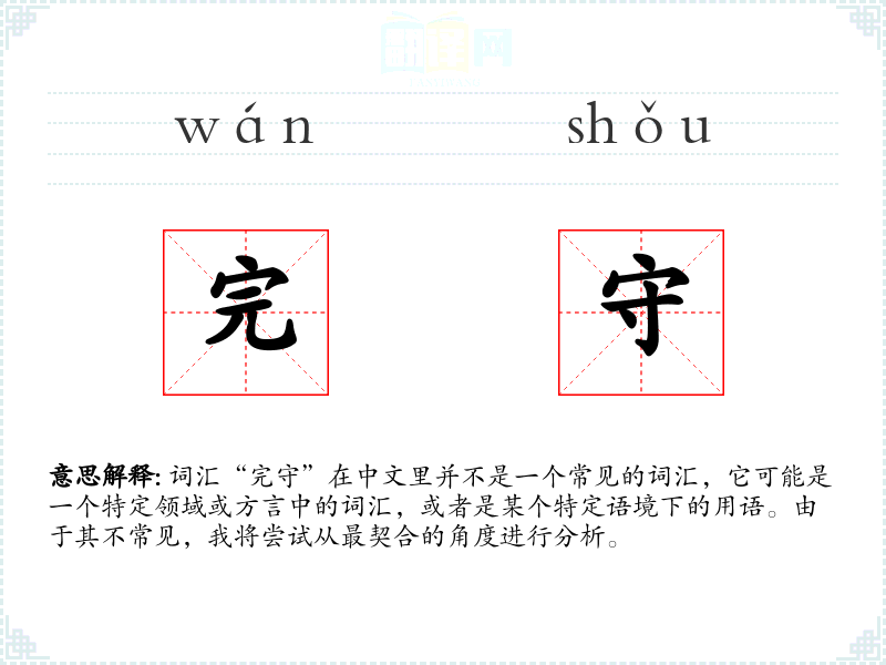 词汇“完守”在中文里并不是一个常见的词汇,它可能是一个特定领域或方言中的词汇,或者是某个特定语境下的用语。由于其不常见,我将尝试从最契合的角度进行分析。