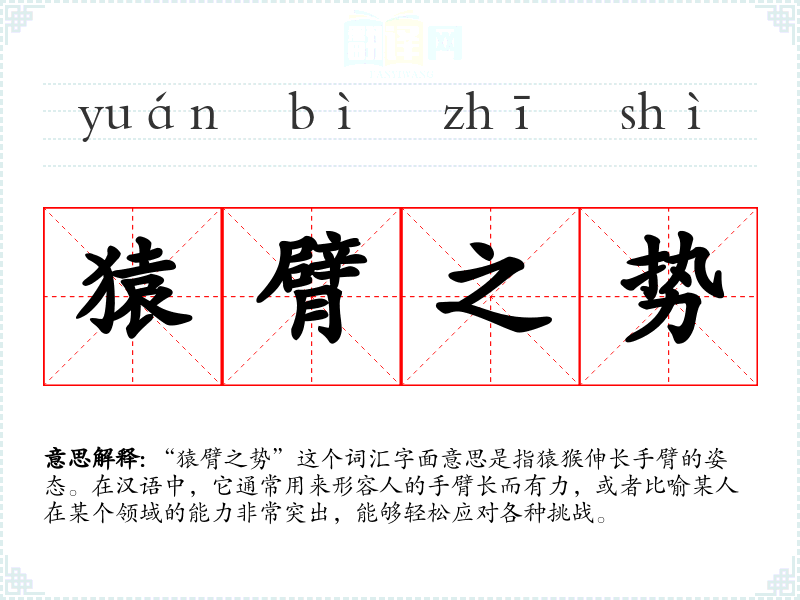“猿臂之势”这个词汇字面意思是指猿猴伸长手臂的姿态。在汉语中,它通常用来形容人的手臂长而有力,或者比喻某人在某个领域的能力非常突出,能够轻松应对各种挑战。