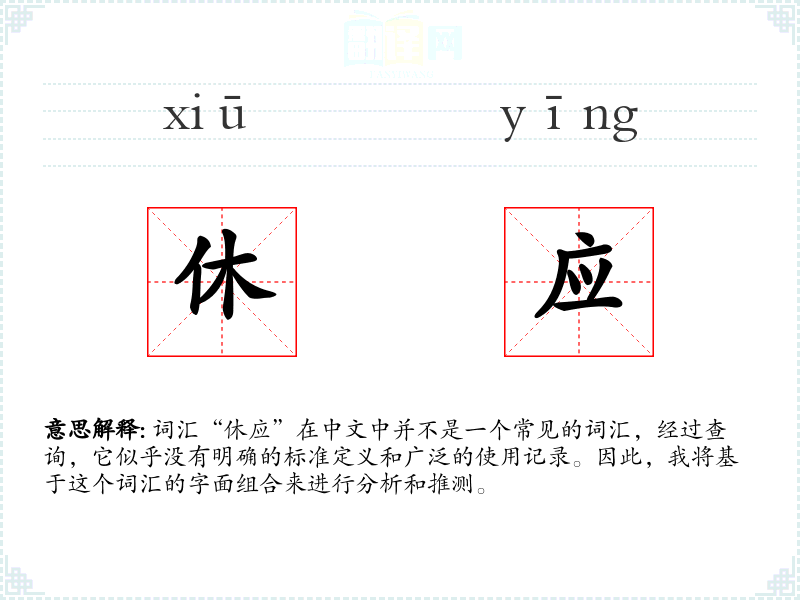 词汇“休应”在中文中并不是一个常见的词汇,经过查询,它似乎没有明确的标准定义和广泛的使用记录。因此,我将基于这个词汇的字面组合来进行分析和推测。