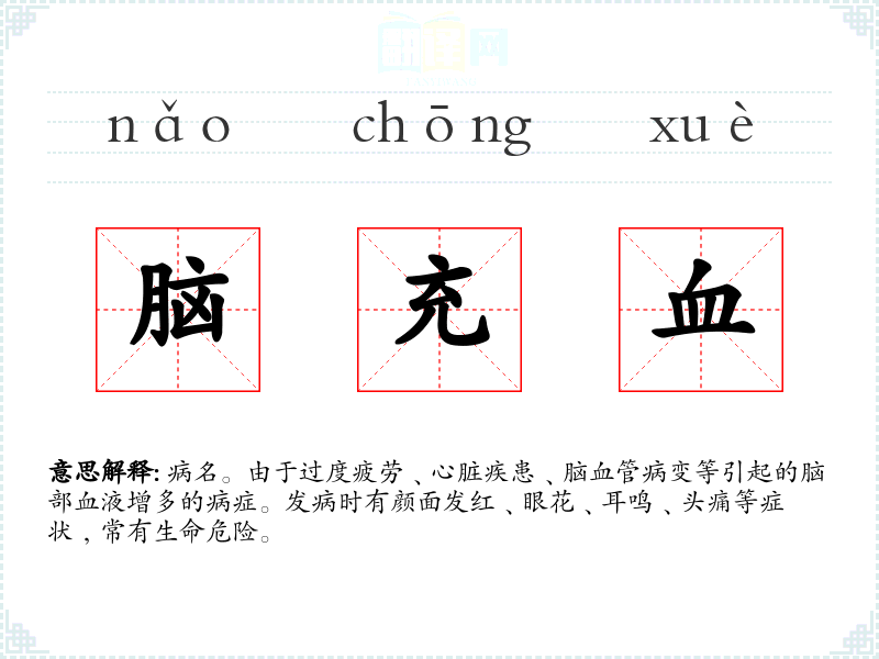 病名。由于过度疲劳﹑心脏疾患﹑脑血管病变等引起的脑部血液增多的病症。发病时有颜面发红﹑眼花﹑耳鸣﹑头痛等症状﹐常有生命危险。