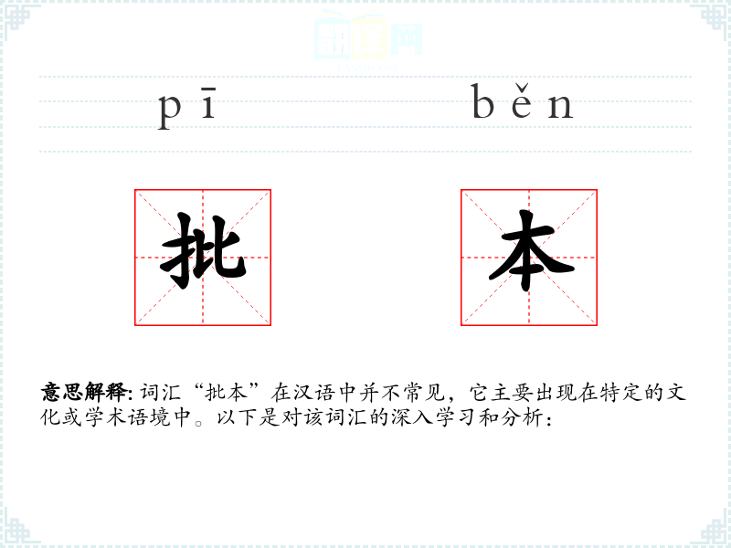 词汇“批本”在汉语中并不常见,它主要出现在特定的文化或学术语境中。以下是对该词汇的深入学*和分析: