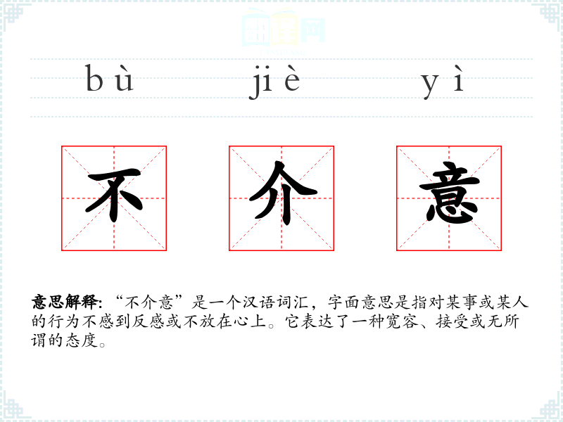 “不介意”由“不”和“介意”组成。“介意”源自古代汉语,意为心中有事,放在心上。随着语言的发展,“不介意”逐渐成为表达宽容和无所谓的常用词汇。