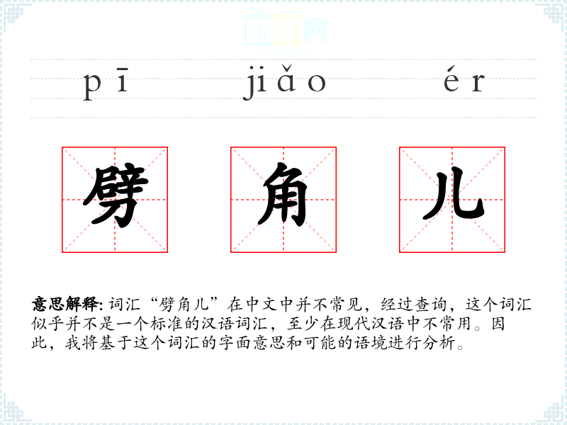 词汇“劈角儿”在中文中并不常见,经过查询,这个词汇似乎并不是一个标准的汉语词汇,至少在现代汉语中不常用。因此,我将基于这个词汇的字面意思和可能的语境进行分析。