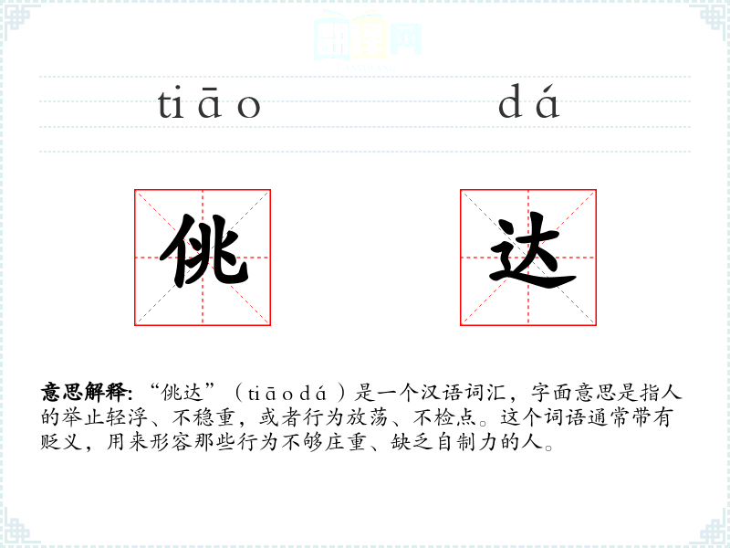 “佻达”(tiāo dá)是一个汉语词汇,字面意思是指人的举止轻浮、不稳重,或者行为放荡、不检点。这个词语通常带有贬义,用来形容那些行为不够庄重、缺乏自制力的人。