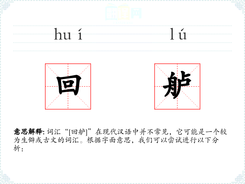 词汇“[回舻]”在现代汉语中并不常见,它可能是一个较为生僻或古文的词汇。根据字面意思,我们可以尝试进行以下分析: