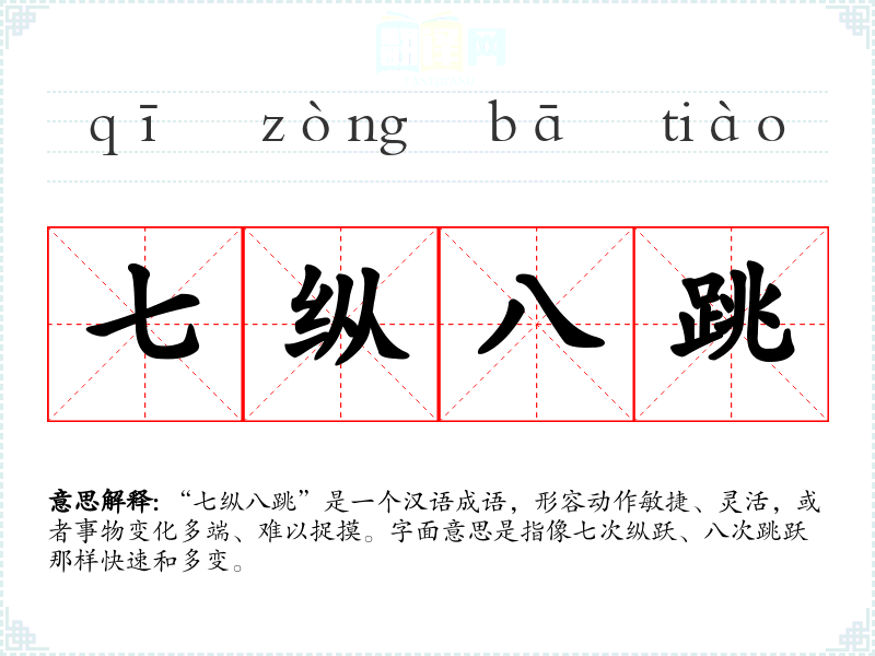 “七纵八跳”是一个汉语成语,形容动作敏捷、灵活,或者事物变化多端、难以捉摸。字面意思是指像七次纵跃、八次跳跃那样快速和多变。