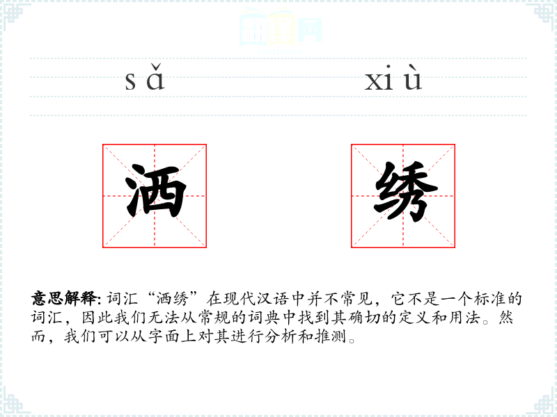 词汇“洒绣”在现代汉语中并不常见,它不是一个标准的词汇,因此我们无法从常规的词典中找到其确切的定义和用法。然而,我们可以从字面上对其进行分析和推测。