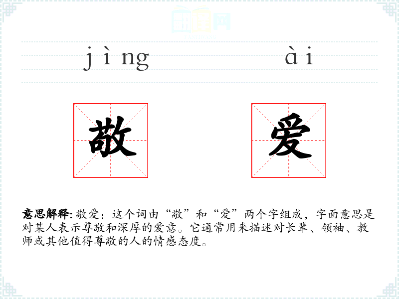 敬爱:这个词由“敬”和“爱”两个字组成,字面意思是对某人表示尊敬和深厚的爱意。它通常用来描述对长辈、领袖、教师或其他值得尊敬的人的情感态度。