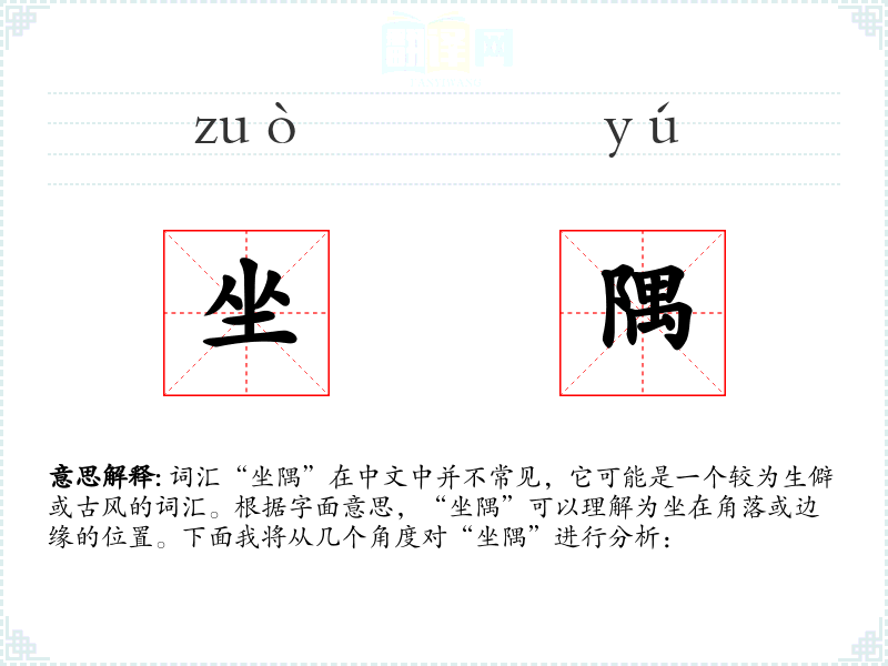 词汇“坐隅”在中文中并不常见,它可能是一个较为生僻或古风的词汇。根据字面意思,“坐隅”可以理解为坐在角落或边缘的位置。下面我将从几个角度对“坐隅”进行分析: