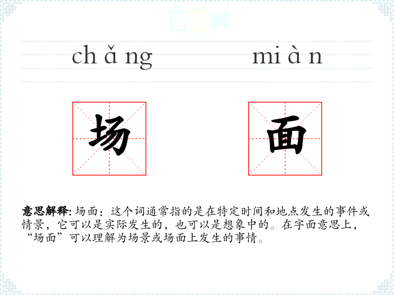 场面:这个词通常指的是在特定时间和地点发生的**或情景,它可以是实际发生的,也可以是想象中的。在字面意思上,“场面”可以理解为场景或场面上发生的事情。