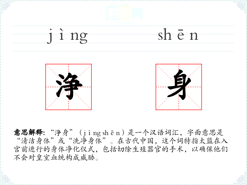 “浄身”(jìng shēn)是一个汉语词汇,字面意思是“清洁身体”或“洗净身体”。在古代**,这个词特指太监在入宫前进行的身体净化仪式,包括切除生殖器官的手术,以确保他们不会对皇室血统构成威胁。