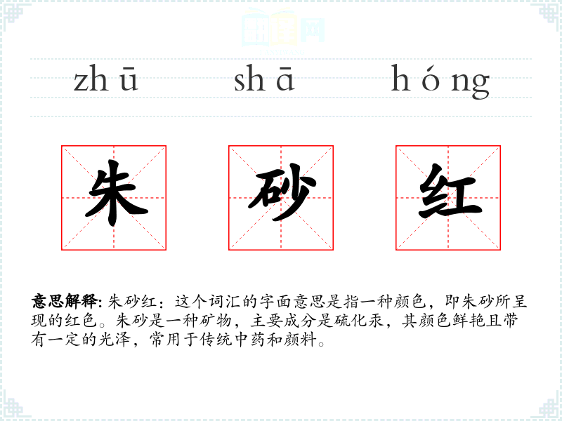 朱砂红:这个词汇的字面意思是指一种颜色,即朱砂所呈现的红色。朱砂是一种矿物,主要成分是硫化汞,其颜色鲜艳且带有一定的光泽,常用于传统中药和颜料。