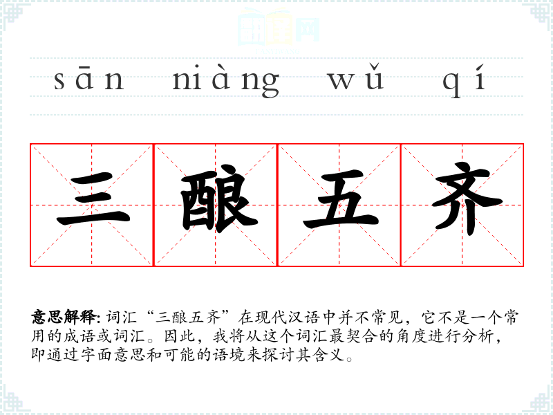 由于“三酿五齐”不是一个常用词汇,它在不同语言或文化中的对应词汇及其使用情况不详。