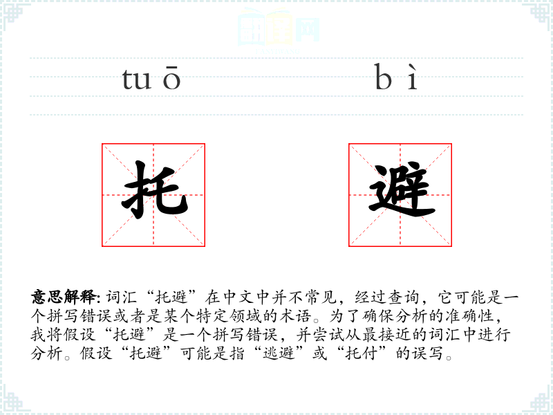 词汇“托避”在中文中并不常见,经过查询,它可能是一个拼写错误或者是某个特定领域的术语。为了确保分析的准确性,我将假设“托避”是一个拼写错误,并尝试从最接近的词汇中进行分析。假设“托避”可能是指“逃避”或“托付”的误写。