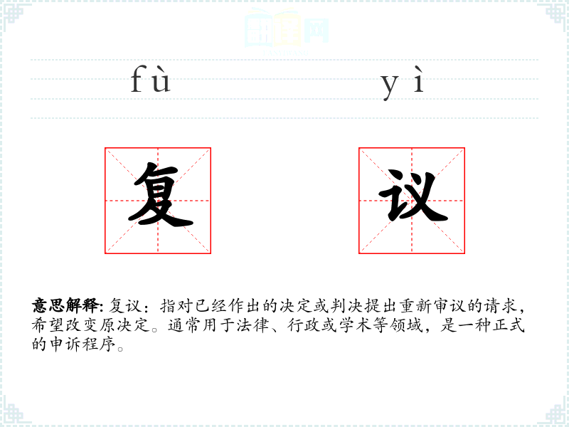 复议:指对已经作出的决定或判决提出重新审议的请求,希望改变原决定。通常用于法律、行政或学术等领域,是一种正式的申诉程序。