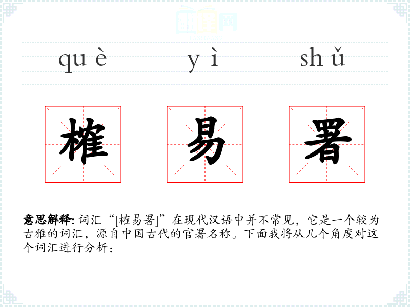 词汇“[榷易署]”在现代汉语中并不常见,它是一个较为古雅的词汇,源自**古代的官署名称。下面我将从几个角度对这个词汇进行分析: