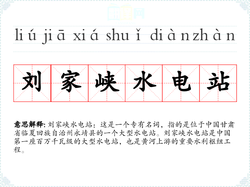 刘家峡水电站:这是一个专有名词,指的是位于甘肃省临夏回族自治州永靖县的一个大型水电站。刘家峡水电站是第一座百万千瓦级的大型水电站,也是黄河上游的重要水利枢纽工程。
