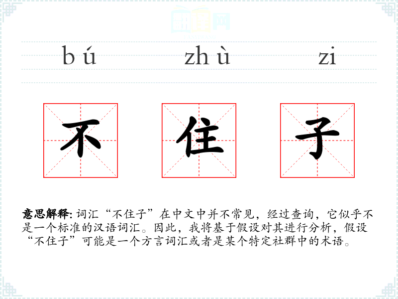 词汇“不住子”在中文中并不常见,经过查询,它似乎不是一个标准的汉语词汇。因此,我将基于假设对其进行分析,假设“不住子”可能是一个方言词汇或者是某个特定社群中的术语。