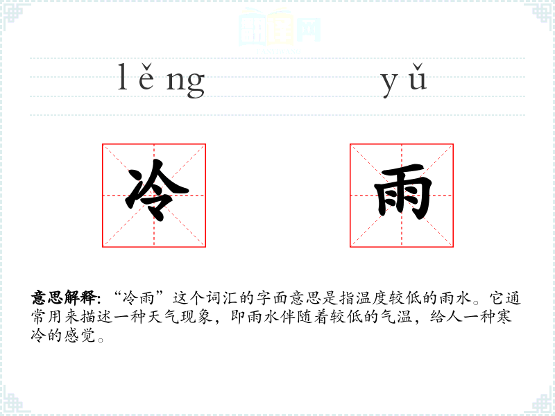 “冷雨”这个词汇的字面意思是指温度较低的雨水。它通常用来描述一种天气现象,即雨水伴随着较低的气温,给人一种寒冷的感觉。