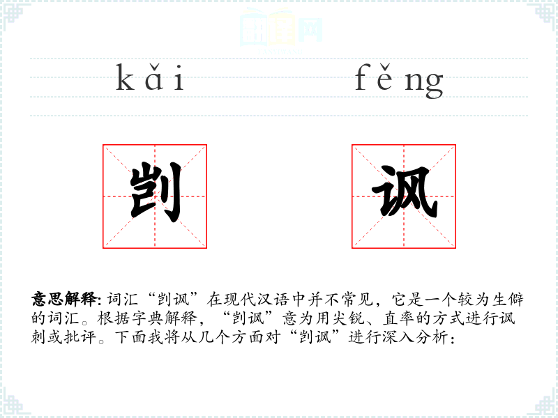 词汇“剀讽”在现代汉语中并不常见,它是一个较为生僻的词汇。根据字典解释,“剀讽”意为用尖锐、直率的方式进行讽刺或批评。下面我将从几个方面对“剀讽”进行深入分析: