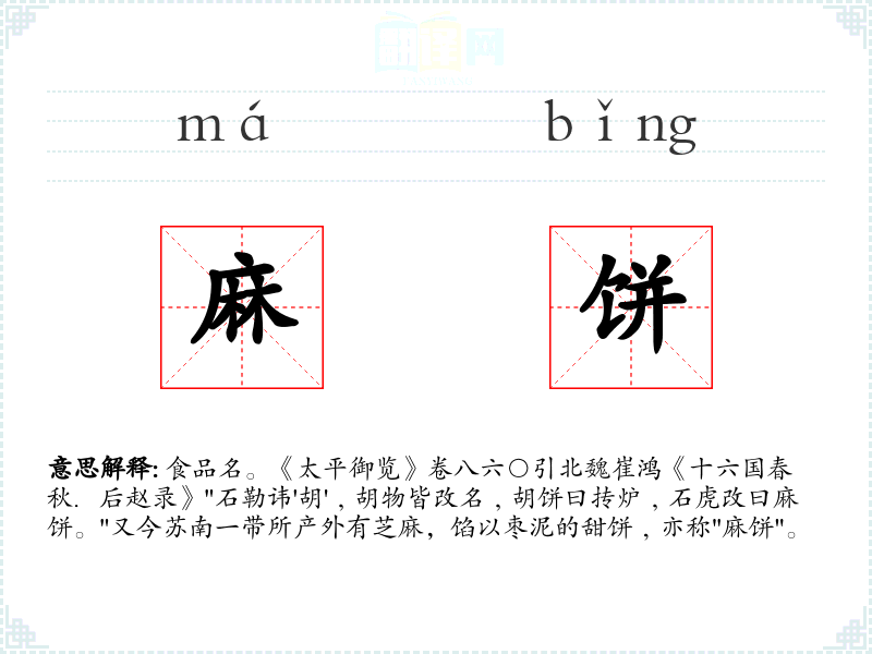 食品名。《太平御览》卷八六○引北魏崔鸿《十六国春秋.后赵录》"石勒讳'胡'﹐胡物皆改名﹐胡饼曰抟炉﹐石虎改曰麻饼。"又今苏南一带所产外有芝麻,馅以枣泥的甜饼﹐亦称"麻饼"。