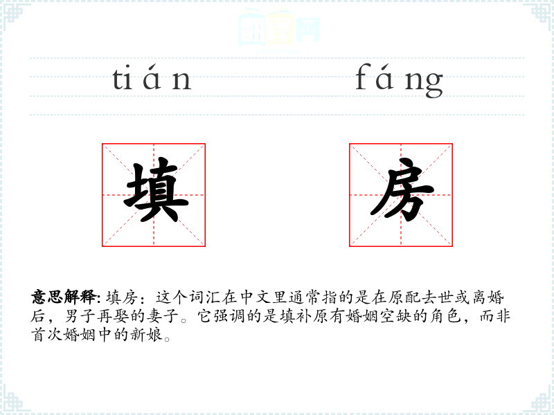 填房:这个词汇在中文里通常指的是在原配去世或离婚后,男子再娶的妻子。它强调的是填补原有婚姻空缺的角色,而非首次婚姻中的新娘。