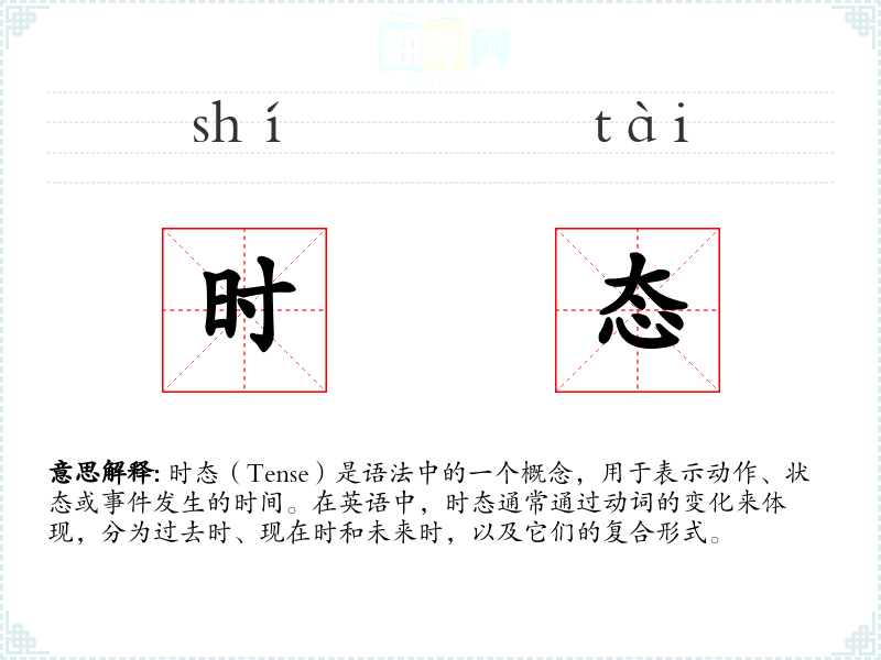 时态(Tense)是语法中的一个概念,用于表示动作、状态或**发生的时间。在英语中,时态通常通过动词的变化来体现,分为过去时、现在时和未来时,以及它们的复合形式。