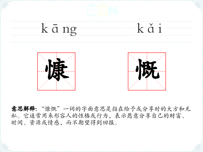 “慷慨”一词的字面意思是指在给予或分享时的大方和无私。它通常用来形容人的性格或行为,表示愿意分享自己的财富、时间、资源或情感,而不期望得到回报。