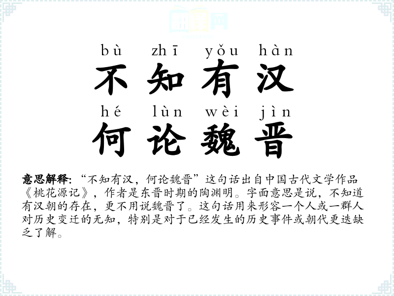 - bù zhī yǒu hàn,hé lùn wèi jìn不知有汉,何论魏晋