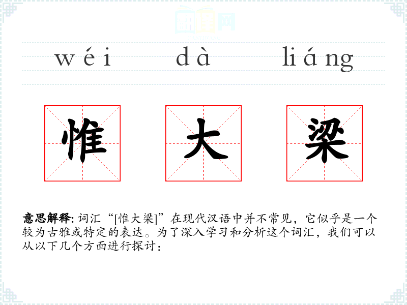 词汇“[惟大梁]”在现代汉语中并不常见,它似乎是一个较为古雅或特定的表达。为了深入学*和分析这个词汇,我们可以从以下几个方面进行探讨: