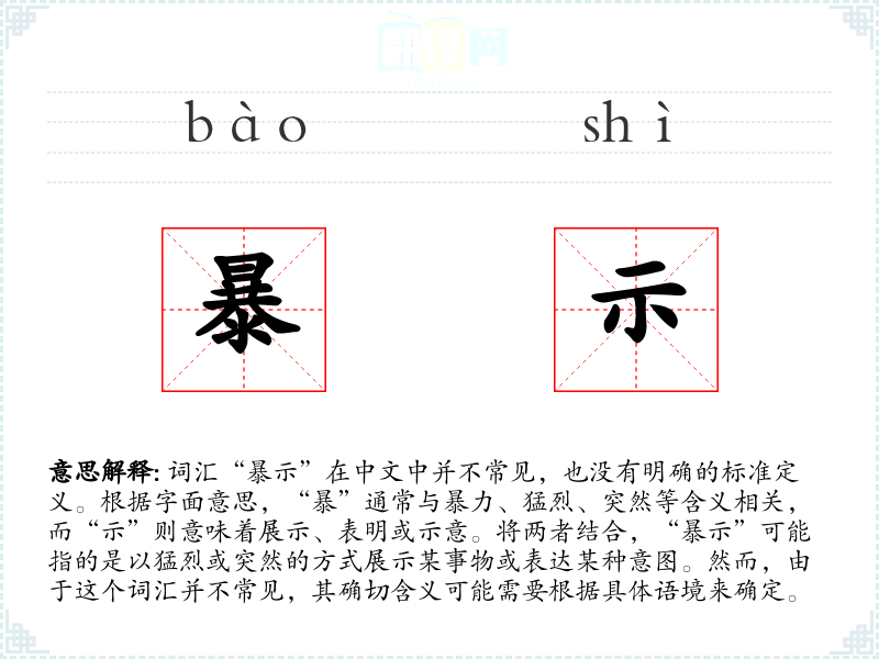 词汇“暴示”在中文中并不常见,也没有明确的标准定义。根据字面意思,“暴”通常与暴力、猛烈、突然等含义相关,而“示”则意味着展示、表明或示意。将两者结合,“暴示”可能指的是以猛烈或突然的方式展示某事物或表达某种意图。然而,由于这个词汇并不常见,其确切含义可能需要根据具体语境来确定。