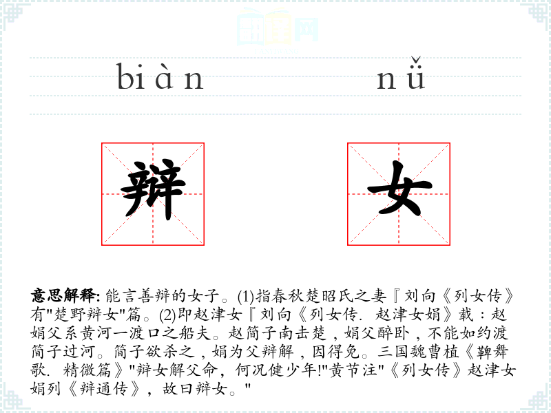 1.能言善辩的女子。(1)指春秋楚昭氏之妻『刘向《列女传》有"楚野辩女"篇。(2)即赵津女『刘向《列女传.赵津女娟》载﹕赵娟父系黄河一渡口之船夫。赵简子南击楚﹐娟父醉卧﹐不能如约渡简子过河。简子欲杀之﹐娟为父辩解﹐因得免。三国魏曹植《鞞舞歌.精微篇》"辩女解父命,何况健少年!"黄节注"《列女传》赵津女娟列《辩通传》,故曰辩女。"