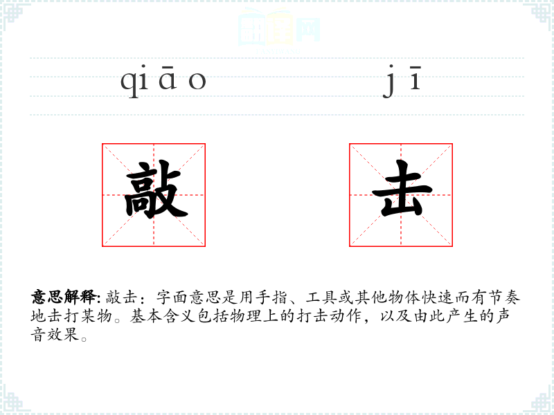 敲击:字面意思是用手指、工具或其他物体快速而有节奏地击打某物。基本含义包括物理上的打击动作,以及由此产生的声音效果。