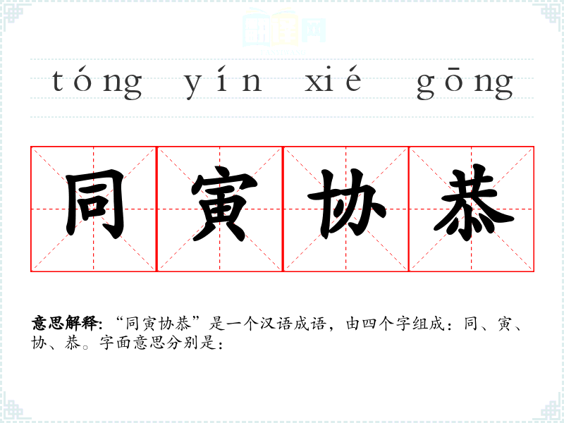 “同寅协恭”是一个汉语成语,由四个字组成:同、寅、协、恭。字面意思分别是: