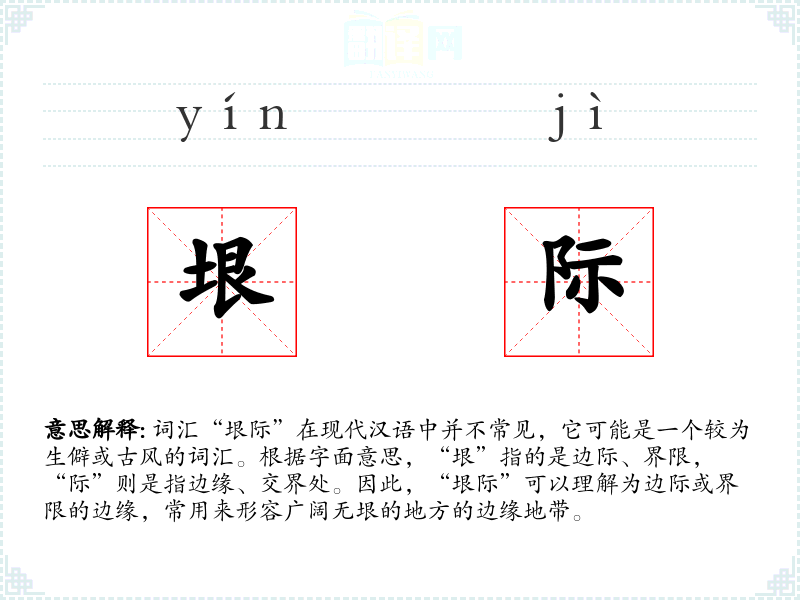 词汇“垠际”在现代汉语中并不常见,它可能是一个较为生僻或古风的词汇。根据字面意思,“垠”指的是边际、界限,“际”则是指边缘、交界处。因此,“垠际”可以理解为边际或界限的边缘,常用来形容广阔无垠的地方的边缘地带。