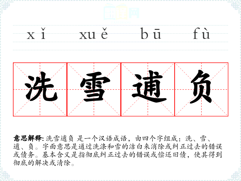 洗雪逋负 是一个汉语成语,由四个字组成:洗、雪、逋、负。字面意思是通过洗涤和雪的洁白来消除或纠正过去的错误或债务。基本含义是指彻底纠正过去的错误或偿还旧债,使其得到彻底的解决或清除。