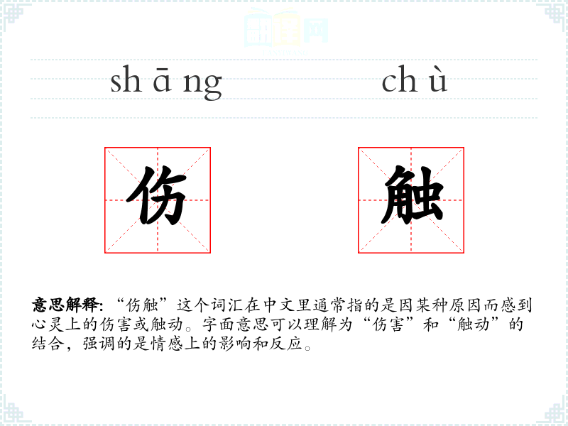 “伤触”这个词的构成较为直观,由“伤”和“触”两个字组成,这两个字在中文里都有悠久的历史。随着语言的发展,这个词的使用逐渐固定下来,用来描述情感上的深刻影响。