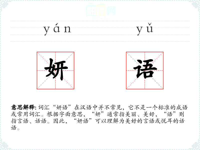 词汇“妍语”在汉语中并不常见,它不是一个标准的成语或常用词汇。根据字面意思,“妍”通常指美丽、美好,“语”则指言语、话语。因此,“妍语”可以理解为美好的言语或悦耳的话语。