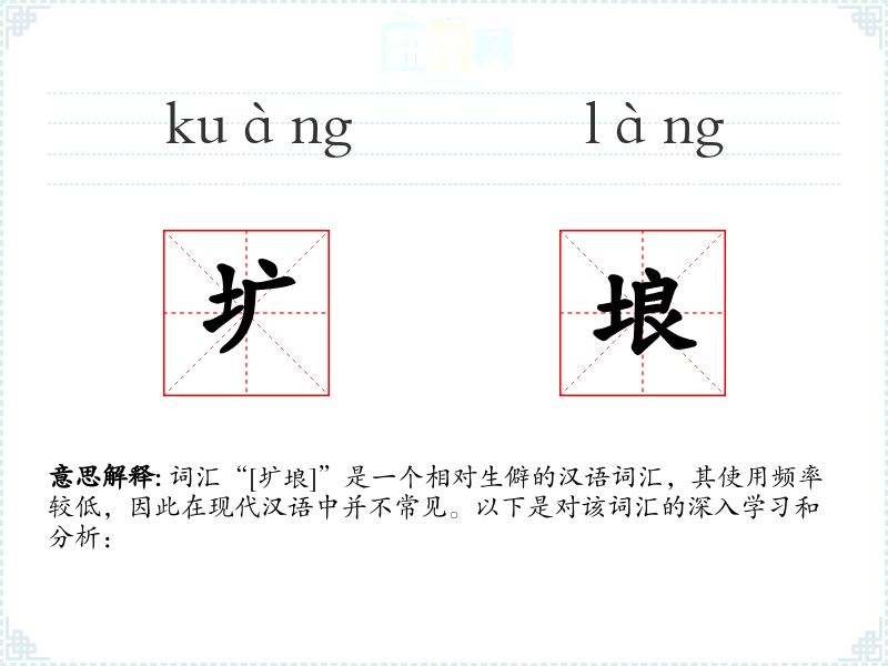 - 理解:“圹埌”是一个具有特定文化背景和历史意义的词汇,虽然在现代汉语中不常用,但在文学和历史研究中仍有其价值。