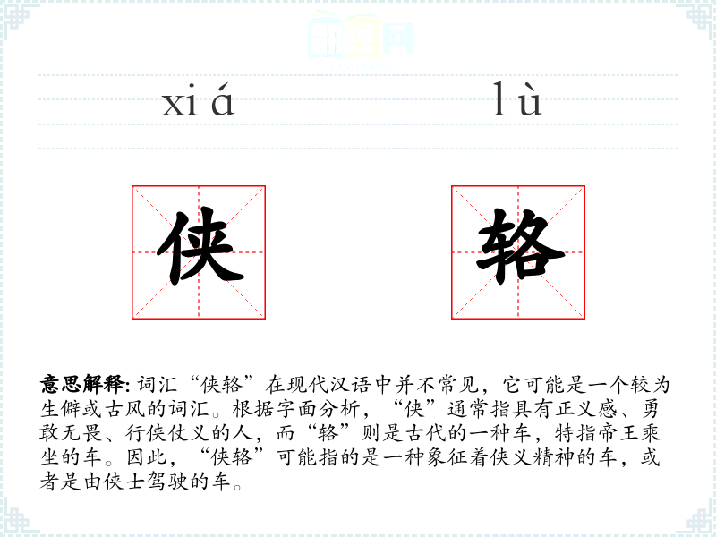 - 对应词汇:在其他语言中可能没有直接对应的词汇,因为“侠辂”具有浓厚的**文化特色。