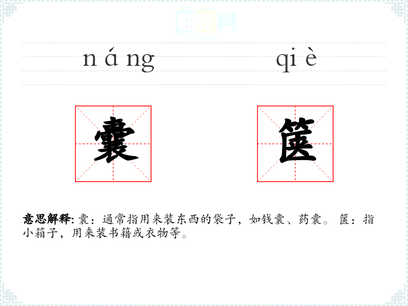 囊:通常指用来装东西的袋子,如钱囊、药囊。 箧:指小箱子,用来装书籍或衣物等。