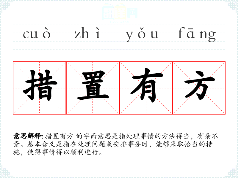措置有方 源自汉语,其中“措置”意为处理、安排,“有方”意为有方法、得当。这个词组在古代文献中已有使用,如《左传》等,随着时间的推移,其含义和用法基本保持稳定。