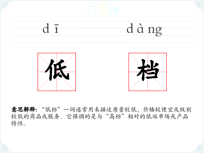 “低档”一词通常用来描述质量较低、价格较便宜或级别较低的商品或服务。它强调的是与“高档”相对的低端市场或产品特性。