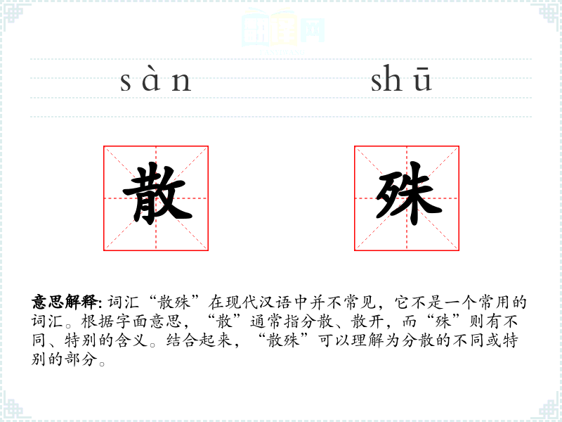 “散殊”的字面意思和基本含义是分散的、不同的或特别的部分。