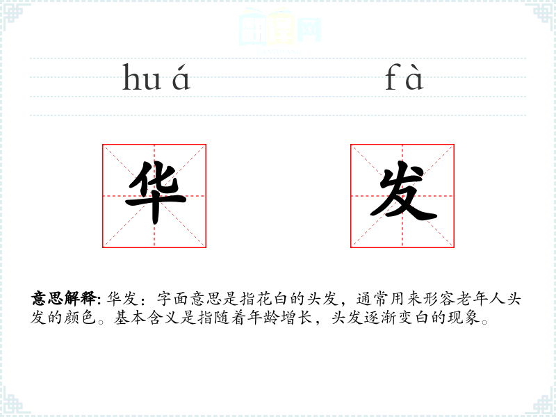 华发:字面意思是指花白的头发,通常用来形容老年人头发的颜色。基本含义是指随着年龄增长,头发逐渐变白的现象。