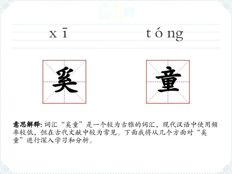 词汇“奚童”是一个较为古雅的词汇,现代汉语中使用频率较低,但在古代文献中较为常见。下面我将从几个方面对“奚童”进行深入学习和分析。
